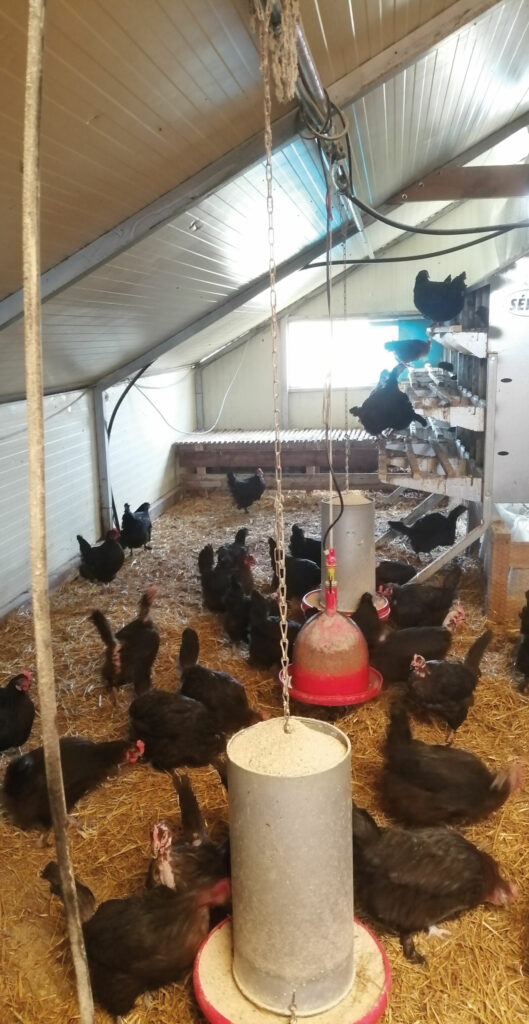 Nos poules pondeuses, de race croisée Marans,sont élevées dans des petits bâtiments. Elles ont accès libre à l’extérieur, garantissant une alimentation naturelle et un bien-être optimal.